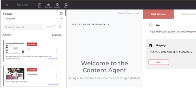 The Content Agent is a blank canvas where you can use AI to transform, analyze, generate or translate any number of content tiles from Magnity into whatever you want Magnity to do (using text).