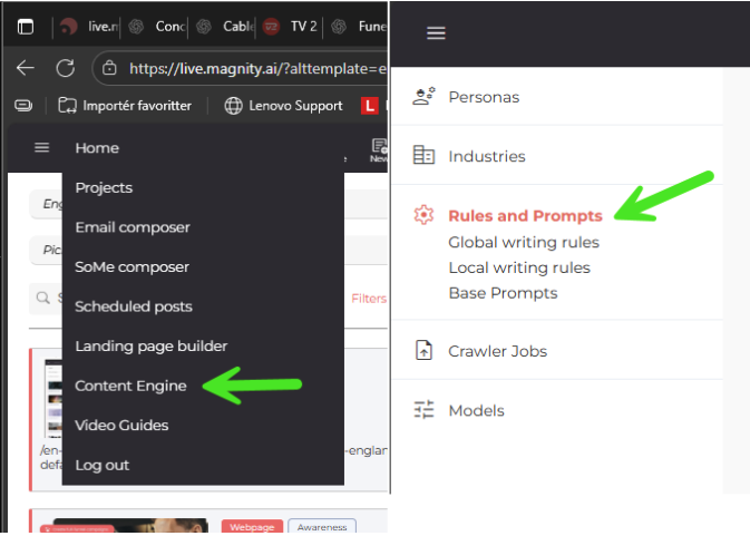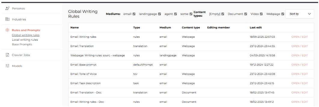 Open the Access Menu → Content Engine → Rules & Prompts. Here you can view or edit global, local, and base rules (depending on permissions).